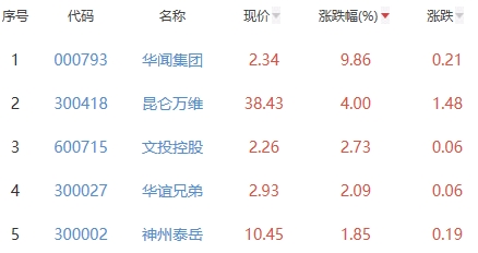 其中,华闻集团、昆仑万维、文投控股、华谊兄弟、神州泰岳位列板块涨幅前五位,涨幅分别为9.86%、4.00%、2.73%、2.09%、1.85%。