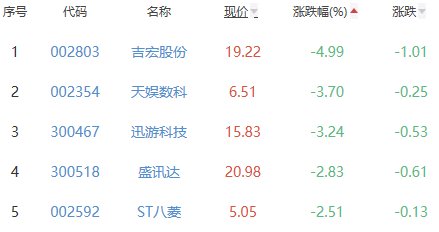 吉宏股份、天娱数科、迅游科技、盛讯达、ST八菱位列涨幅榜后五位,涨幅分别为-4.99%、-3.70%、-3.24%、-2.83%、-2.51%。