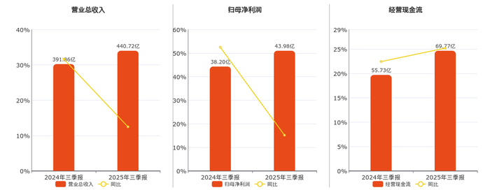 公司营业总收入为440.72亿元,较去年同报告期营业总收入增加48.86亿元,实现2年连续上涨,同比较去年同期上涨12.47%。归母净利润为43.98亿元,较去年同报告期归母净利润增加5.78亿元,实现2年连续上涨,同比较去年同期上涨15.14%。经营活动现金净流入为69.77亿元,较去年同报告期经营活动现金净流入增加14.04亿元,实现2年连续上涨,同比较去年同期上涨25.19%。