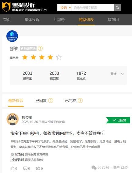 在业绩下滑和业务发展受阻的背后,创维数字也正面临消费者信任的挑战。在黑猫投诉[下载黑猫投诉客户端]平台上,截至10月26日,关于创维的投诉量达到2033起,其中内容涉及关于产品质量、拖延维修、拒绝履行三包义务、虚假宣传等问题等,部分投诉调解失败,显示售后服务或存在漏洞。
