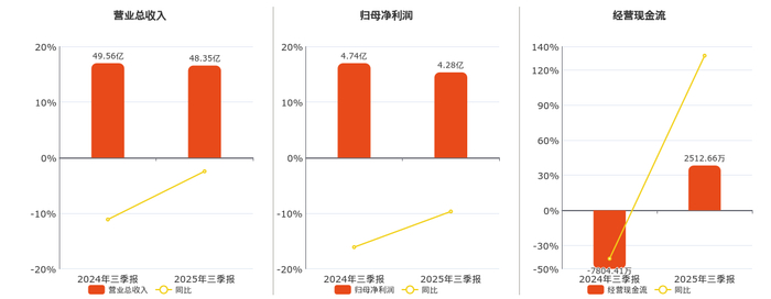 公司营业总收入为48.35亿元,在已披露的同业公司中排名第7,较去年同报告期营业总收入减少1.21亿元,同比较去年同期下降2.45%。归母净利润为4.28亿元,在已披露的同业公司中排名第9,较去年同报告期归母净利润减少4588.04万元,同比较去年同期下降9.68%。经营活动现金净流入为2512.66万元,在已披露的同业公司中排名第135,较去年同报告期经营活动现金净流入增加1.03亿元。