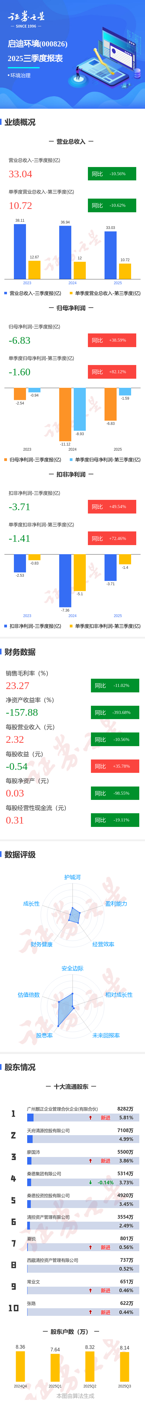 证券之星消息,启迪环境2025年三季报显示,前三季度公司主营收入33.04亿元,同比下降10.57%;归母净利润-6.83亿元,同比上升38.6%;扣非净利润-3.71亿元,同比上升49.55%;其中2025年第三季度,公司单季度主营收入10.72亿元,同比下降10.63%;单季度归母净利润-1.6亿元,同比上升82.13%;单季度扣非净利润-1.41亿元,同比上升72.46%;负债率86.17%,投资收益-2.19亿元,财务费用3.75亿元,毛利率23.27%。