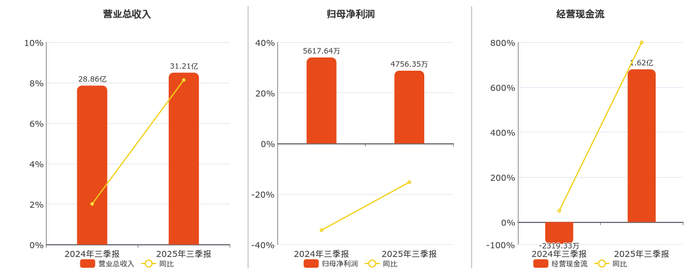公司营业总收入为31.21亿元,较去年同报告期营业总收入增加2.35亿元,实现2年连续上涨,同比较去年同期上涨8.14%。归母净利润为4756.35万元,较去年同报告期归母净利润减少861.30万元,同比较去年同期下降15.33%。经营活动现金净流入为1.62亿元,较去年同报告期经营活动现金净流入增加1.85亿元,实现3年连续上涨。