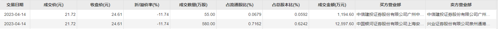 4月14日大宗交易成交635万股,成交额1.38亿元,占当日总成交额的45.29%,成交价21.72元,较市场收盘价24.61元折价11.74%。