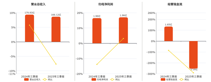 公司营业总收入为166.12亿元。归母净利润为1.96亿元,较去年同报告期归母净利润增加591.68万元,同比较去年同期上涨3.12%。经营活动现金净流入为-3.16亿元。