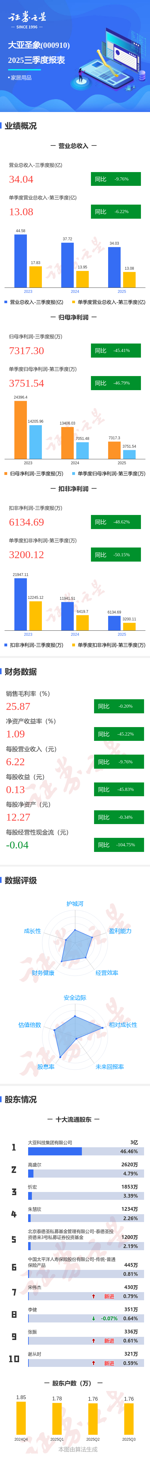 图解大亚圣象三季报:第三季度单季净利润同比下降46.80%