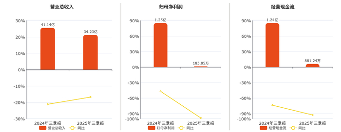 公司营业总收入为34.23亿元,较去年同报告期营业总收入减少6.91亿元,同比较去年同期下降16.79%。归母净利润为183.85万元,较去年同报告期归母净利润减少8423.44万元,同比较去年同期下降97.86%。经营活动现金净流入为881.24万元,较去年同报告期经营活动现金净流入减少1.60亿元,同比较去年同期下降94.78%。