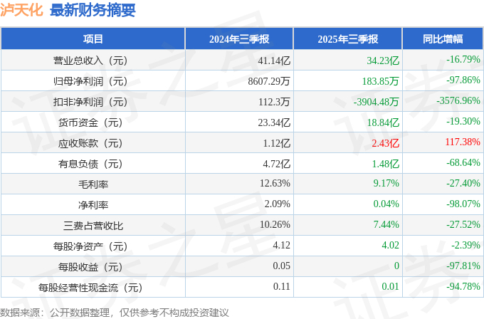 据证券之星公开数据整理,近期泸天化(000912)发布2025年三季报。截至本报告期末,公司营业总收入34.23亿元,同比下降16.79%,归母净利润183.85万元,同比下降97.86%。按单季度数据看,第三季度营业总收入10.44亿元,同比下降15.62%,第三季度归母净利润-4426.41万元,同比上升7.34%。本报告期泸天化应收账款上升,应收账款同比增幅达117.38%。