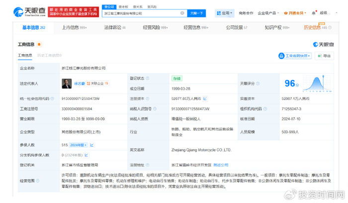 浙江钱江摩托股份有限公司成立于1999年3月,法定代表人为徐志豪,注册资本约5.3亿人民币