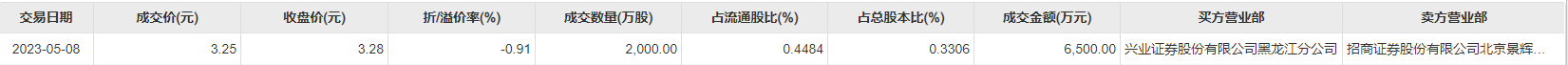 5月8日大宗交易成交2000万股,成交额6500万元,占当日总成交额的11.84%,成交价3.25元,较市场收盘价3.28元折价0.91%。