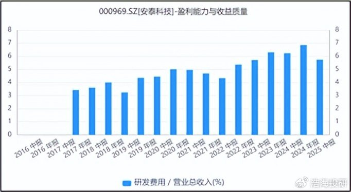 数据显示:自2018年以来,公司的研发投入占比从最初的不到4%,增长为现在的7%,增长幅度明显。2025年上半年同比有所减少,主要是因为安泰环境出表导致。季度数据来看,2025年二季度,研发投入占比约6.51%,环比上升1.61个百分点。