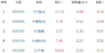 其中,*ST皇台、中葡股份、ST通葡、中粮科技和口子窖位列板块涨幅前五位,涨幅分别为0.94%、0.52%、0.30%、0.27%和0.22%。