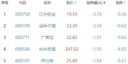 江中药业、金种子酒、广誉远、古井贡酒和伊力特位列涨幅榜后五位,涨幅分别为-2.78%、-2.59%、-1.97%、-1.95%和-1.94%。