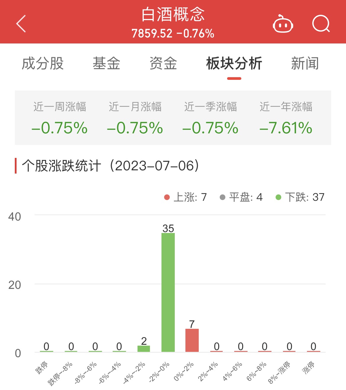 中国经济网北京7月6日讯今日,白酒概念板块整体涨幅-0.76%,其中7只股票上涨,4只股票平盘,37只股票下跌。