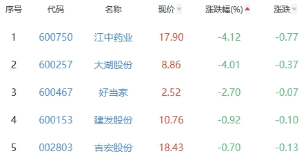 江中药业、大湖股份、好当家、建发股份、吉宏股份位列涨幅榜后五位,涨幅分别为-4.12%、-4.01%、-2.70%、-0.92%、-0.70%。