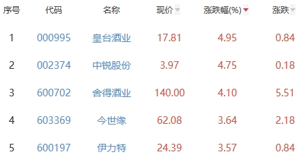 其中,皇台酒业、中锐股份、舍得酒业、今世缘、伊力特位列板块涨幅前五位,涨幅分别为4.95%、4.75%、4.10%、3.64%、3.57%。