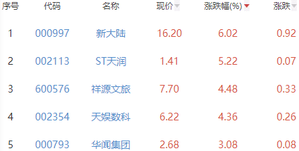 其中,新大陆、ST天润、祥源文旅、天娱数科和华闻集团位列板块涨幅前五位,涨幅分别为6.02%、5.22%、4.48%、4.36%和3.08%。