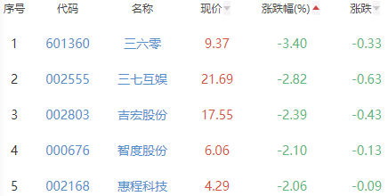 三六零、三七互娱、吉宏股份、智度股份和惠程科技位列涨幅榜后五位,涨幅分别为-3.40%、-2.82%、-2.39%、-2.10%和-2.06%。