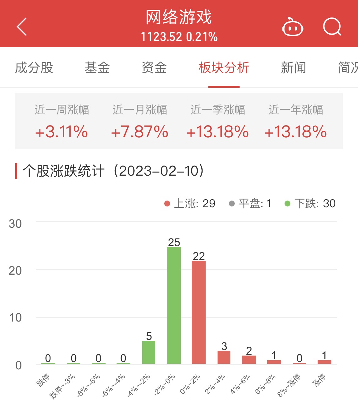中国经济网北京2月10日讯今日,网络游戏板块整体涨幅0.21%,其中29只股票上涨,1只股票平盘,30只股票下跌。