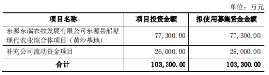 东瑞股份募集资金总额为20.07亿元,扣除发行费用后,募集资金净额为18.10亿元。东瑞股份于2021年4月13日披露的招股说明书显示,公司拟募集资金18.10亿元,用于紫金东瑞农业发展有限公司富竹生态养殖项目、连平东瑞农牧发展有限公司传统养殖改高床养殖节能减排增效项目、和平东瑞农牧发展有限公司高床生态养殖项目、东瑞食品集团股份有限公司致富猪场改扩建(灯塔种猪场迁改)项目、河源市瑞昌饲料有限公司扩产建设项目、补充流动资金。