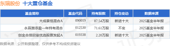 持有东瑞股份最多的基金为大成景恒混合A,目前规模为3.97亿元,最新净值3.405(8月29日),较上一交易日下跌0.05%,近一年上涨95.7%。该基金现任基金经理为苏秉毅。