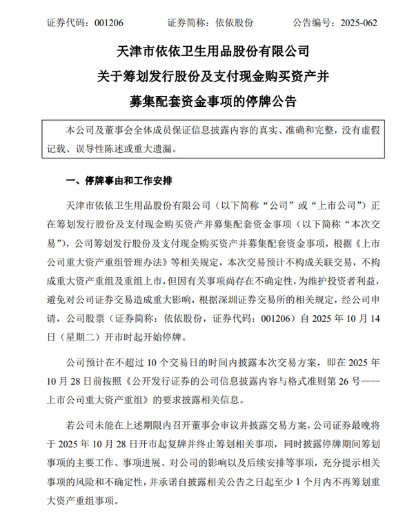 依依股份:筹划发行股份及支付现金购买资产并募集配套资金 公司股票自2025年10月14日开市时起开始停牌