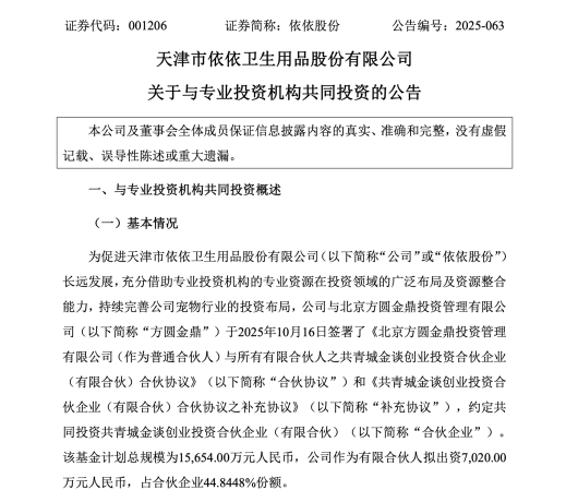 自10月13日官宣并购杭州高爷家有好多猫宠物食品有限责任公司(简称“高爷家”)之后,10 月 16 日,依依股份又宣布与北京方圆金鼎投资管理有限公司(以下简称 “方圆金鼎”)共同投资共青城金谈创业投资合伙企业。