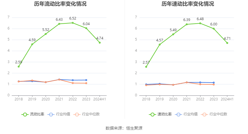 2024年上半年,公司流动比率为4.74,速动比率为4.71。