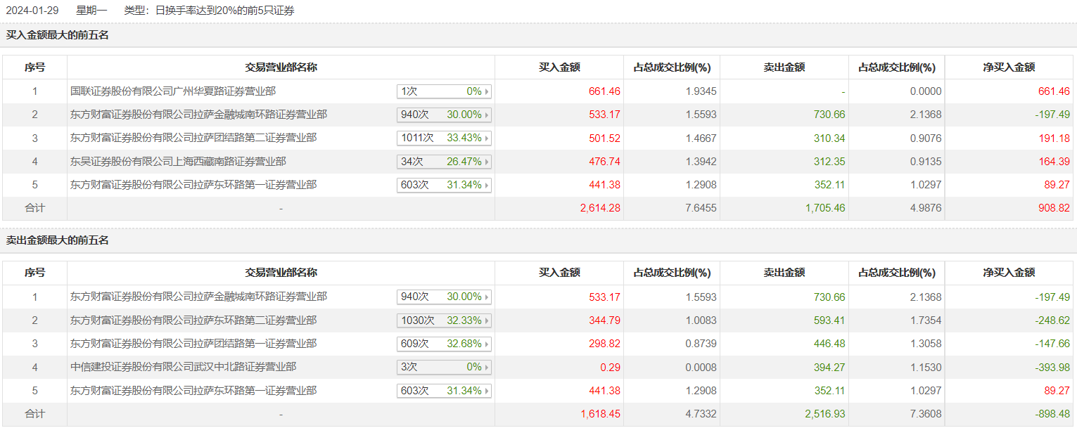 华瓷股份1月29日跌停,全天换手率达36.83%,振幅达6.41%。龙虎榜数据显示,营业部席位合计净买入118.56万元。其中,东方财富证券拉萨金融城南环路证券营业部、东方财富证券拉萨东环路第二证券营业部分别卖出730.66万元、593.41万元;国联证券广州华夏路证券营业部、东方财富证券拉萨金融城南环路证券营业部分别买入661.46万元、533.17万元。