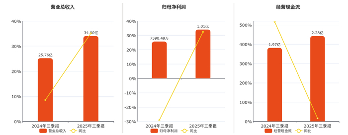 公司营业总收入为34.80亿元。归母净利润为1.01亿元。经营活动现金净流入为2.28亿元。