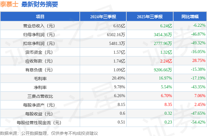 泰慕士(001234)2025年三季报简析:净利润同比下降46.87%,公司应收账款体量较大
