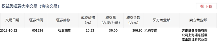 10月22日,弘业期货大宗交易成交30万股,成交额306.9万元,占当日总成交额的1.93%,成交价10.23元,较市场收盘价11.15元折价8.25%。