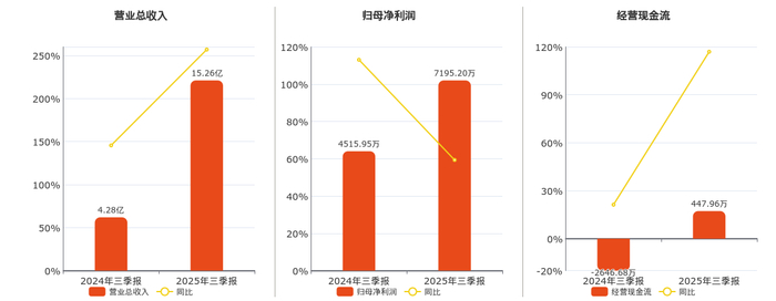 公司营业总收入为15.26亿元。归母净利润为7195.20万元。经营活动现金净流入为447.96万元。