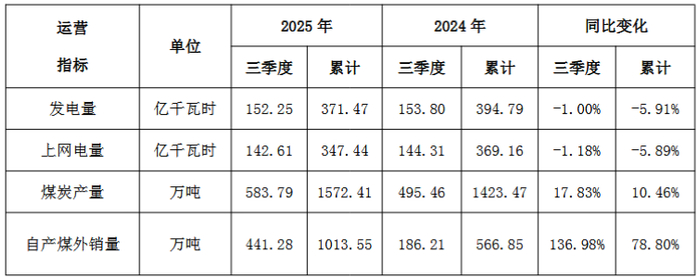 10月15日,陕西能源(001286)发布公告,2025年第三季度主要运营数据显示,公司发电量为152亿千瓦时,同比下降1%,本年累计发电量371亿千瓦时,同比下降5.91%;公司上网电量143亿千瓦时,同比下降1.18%,本年累计上网电量347亿千瓦时,同比下降5.89%。