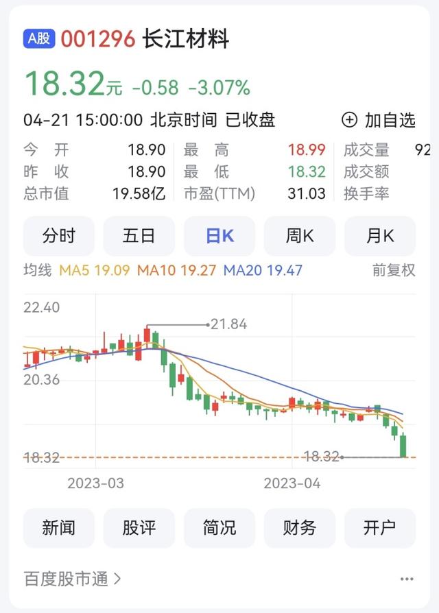 4月21日,长江材料报收18.32元,跌3.07%,换手率2.45%,动态市盈率31.03,总市值19.58亿元,今年以来股价涨幅为-4.68%。
