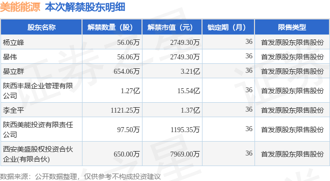 证券之星消息,根据市场公开信息整理,美能能源(001299)于10月31日将有1.53亿股限售股份解禁,为公司首发原股东限售股份,占公司总股本63.1%。(本次数据根据历史公告整理得出,实际情况以上市公司最新公告为准)本次解禁后,公司还有2423.77万股限售股份,占总股本9.99%。具体如下图所示: