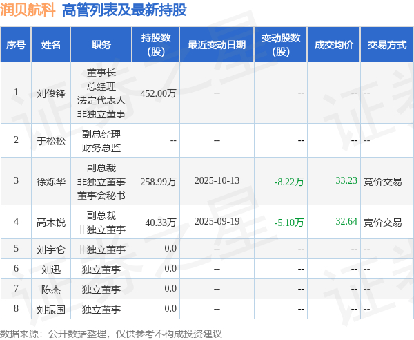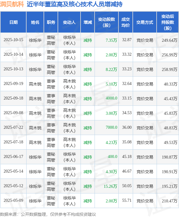 润贝航科近半年内的董监高及核心技术人员增减持详情如下: