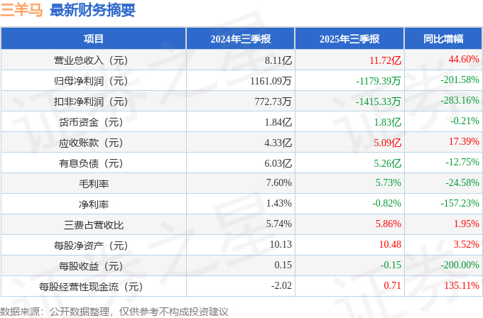 据证券之星公开数据整理,近期三羊马(001317)发布2025年三季报。截至本报告期末,公司营业总收入11.72亿元,同比上升44.6%,归母净利润-1179.39万元,同比下降201.58%。按单季度数据看,第三季度营业总收入3.96亿元,同比上升38.16%,第三季度归母净利润120.57万元,同比下降10.53%。本报告期三羊马公司应收账款体量较大,当期应收账款占最新年报归母净利润比达5921.15%。