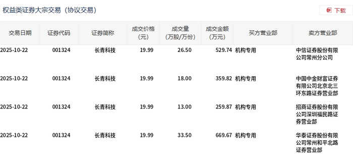 10月22日,长青科技大宗交易成交91万股,成交额1819.1万元,占当日总成交额的31.72%,成交价19.99元,较市场收盘价20.17元折价0.89%。