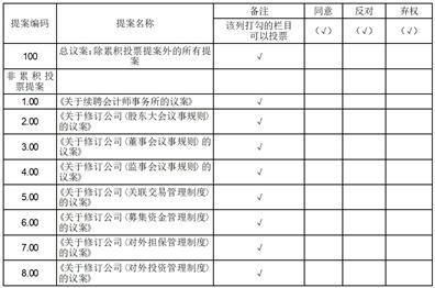 注:1、每项议案只能有一个表决意见,即只能在“同意”、“反对”、“弃权”三栏中任一栏打“√”,其他符号、数字无效;