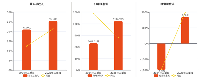 公司营业总收入为45.13亿元。归母净利润为4439.40万元,在已披露的同业公司中排名第15。经营活动现金净流入为2.60亿元,在已披露的同业公司中排名第10。