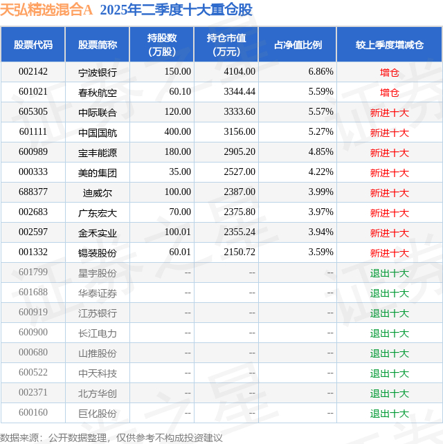 天弘精选混合A的前十大重仓股如下: