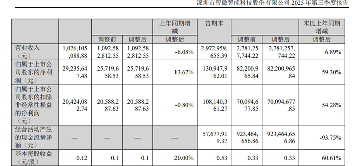 报告显示,智微智能公司前三季度营业收入为29.73亿元,同比增长6.89%;归母净利润为1.31亿元,同比增长59.30%;扣非归母净利润为1.08亿元,同比增长54.28%;基本每股收益0.53元。