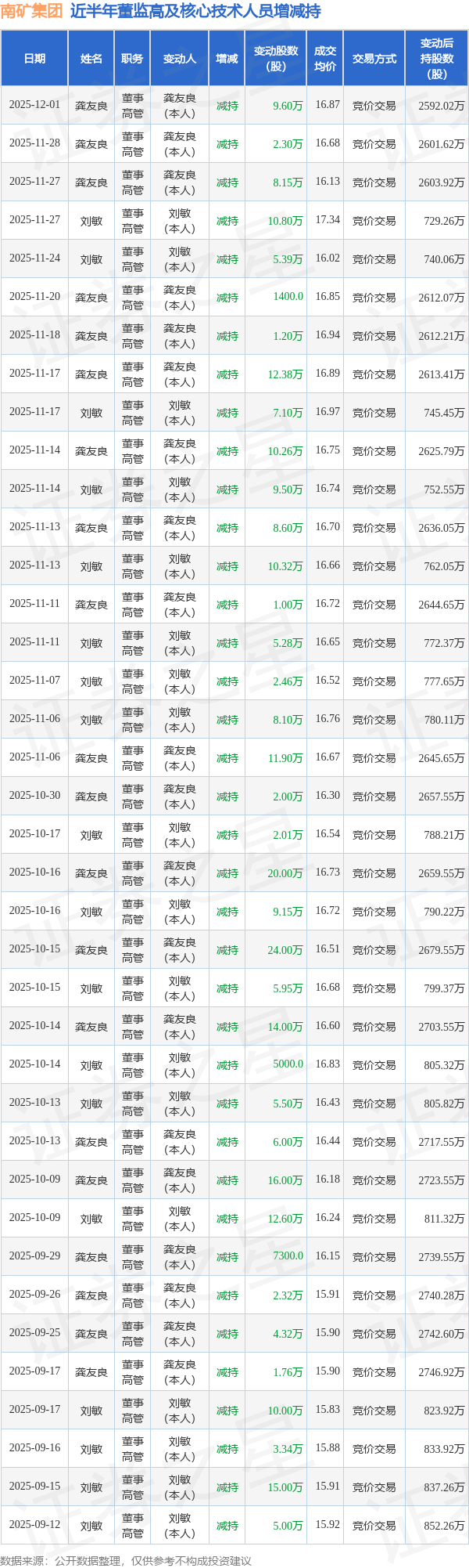 南矿集团:12月1日高管龚友良减持股份合计9.6万股