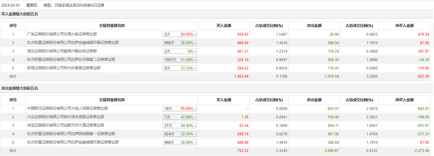 腾达科技2月1日跌停,全天换手率达35.19%,振幅达2.64%。龙虎榜数据显示,营业部席位合计净卖出1431.76万元。其中,中国银河证券大连人民路证券营业部、兴业证券哈尔滨友谊路证券营业部分别卖出843.07万元、750.40万元;广发证券东莞大朗证券营业部、东方财富证券拉萨金融城南环路证券营业部分别买入504.93万元、469.69万元。