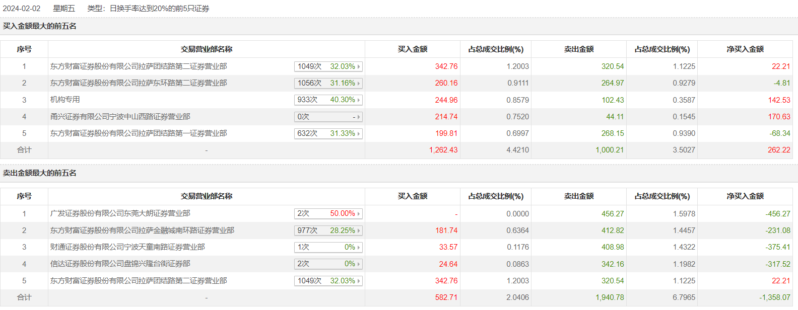 腾达科技2月2日跌8.85%,全天换手率达33.04%,振幅达9.65%。龙虎榜数据显示,营业部席位合计净卖出1118.06万元。其中,机构买入244.96万元,卖出102.43万元,合计净买入142.53万元。此外,广发证券东莞大朗证券营业部、东方财富证券拉萨金融城南环路证券营业部分别卖出456.27万元、412.82万元;东方财富证券拉萨团结路第二证券营业部、东方财富证券拉萨东环路第二证券营业部分别买入342.76万元、260.16万元。