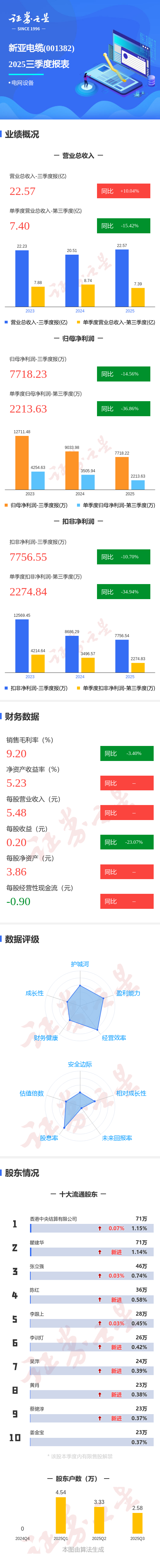 证券之星消息,新亚电缆2025年三季报显示,公司主营收入22.57亿元,同比上升10.05%;归母净利润7718.23万元,同比下降14.56%;扣非净利润7756.55万元,同比下降10.7%;其中2025年第三季度,公司单季度主营收入7.4亿元,同比下降15.43%;单季度归母净利润2213.63万元,同比下降36.86%;单季度扣非净利润2274.84万元,同比下降34.94%;负债率16.0%,投资收益-116.84万元,财务费用148.57万元,毛利率9.2%。