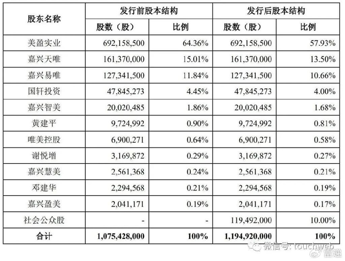 IPO后,美盈实业持股57.93%,嘉兴天唯持股13.5%,嘉兴易唯持股为10.66%,国轩投资持股4%,嘉兴智美持股为1.68%;