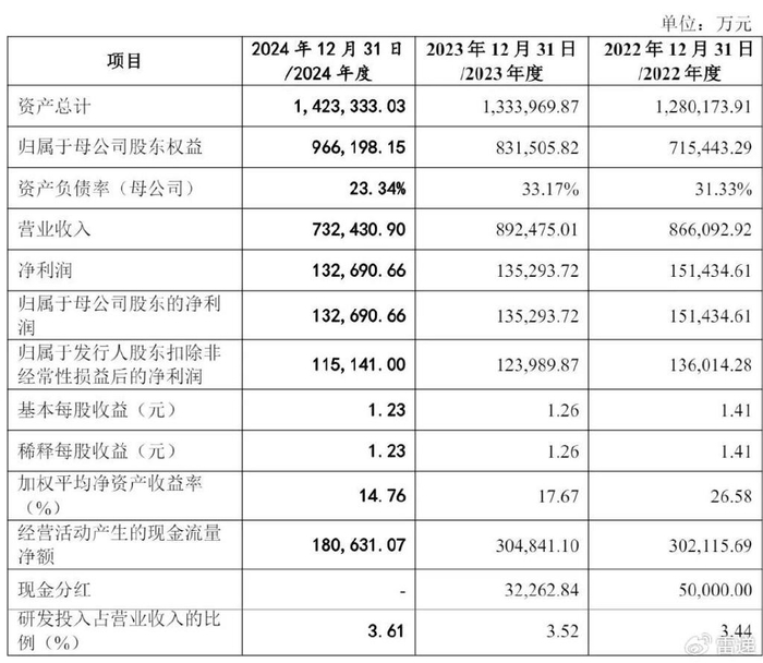 招股书显示,马可波罗2022年、2023年、2024年营收分别为86.6亿元、89.25亿元、73.2亿元;净利分别为15.14亿、13.53亿元、13.3亿元;扣非后净利分别为13.6亿元、12.4亿元、11.51亿元。