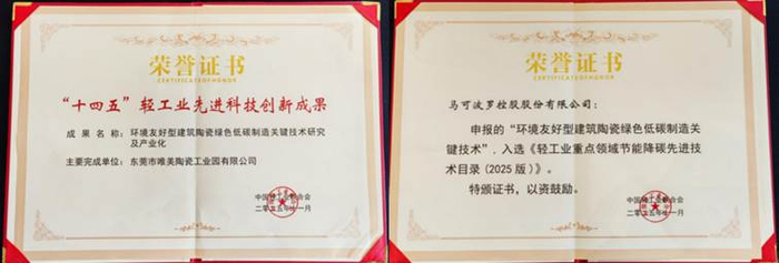 值得关注的是,2025年11月11日,马可波罗自主研发的“环境友好型建筑陶瓷绿色低碳制造关键技术研究及产业化”项目技术成果成功入选《轻工业“十四五”先进科技创新成果》,并被收录于《轻工业重点领域节能降碳先进技术目录(2025版)》。